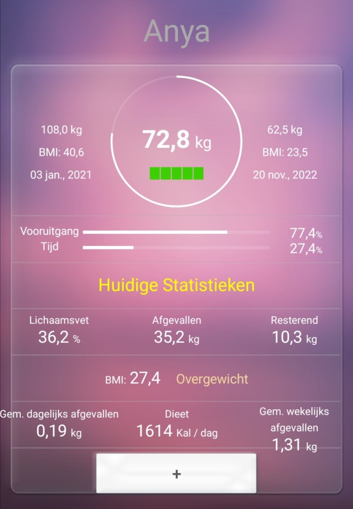 In het begin was mijn doelstelling een gezond BMI bereiken om zo terug gezond te zijn. Nu is dit aan het wijzigen naar ik wil gezond zijn, blij zijn met mijn lijf en mij goed voelen in mijn lijf ook al heb ik volgens het BMI nog steeds “overgewicht”.
